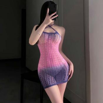 网眼提花开裆连体网衣 镂空透视 流苏肩带