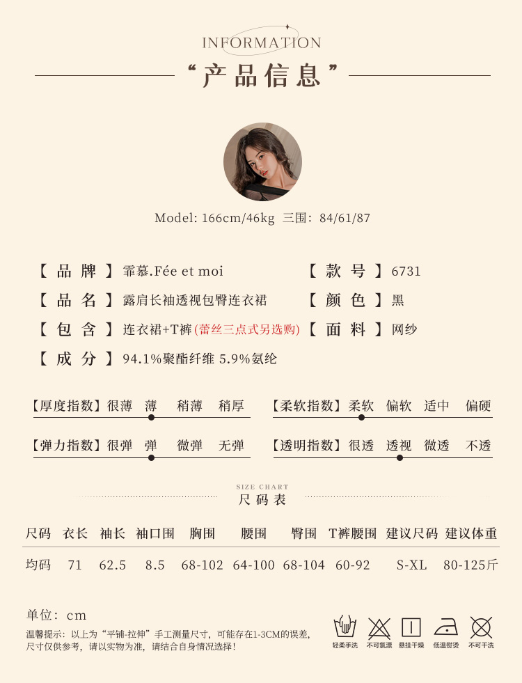 衣服很仙,蕾丝面料微透,若隐若现的,男朋友看了很惊喜,不让脱…而且质量也不错。有故事有情调